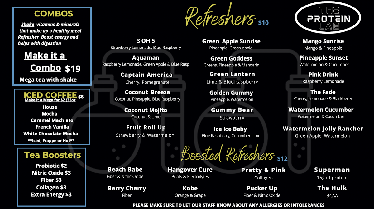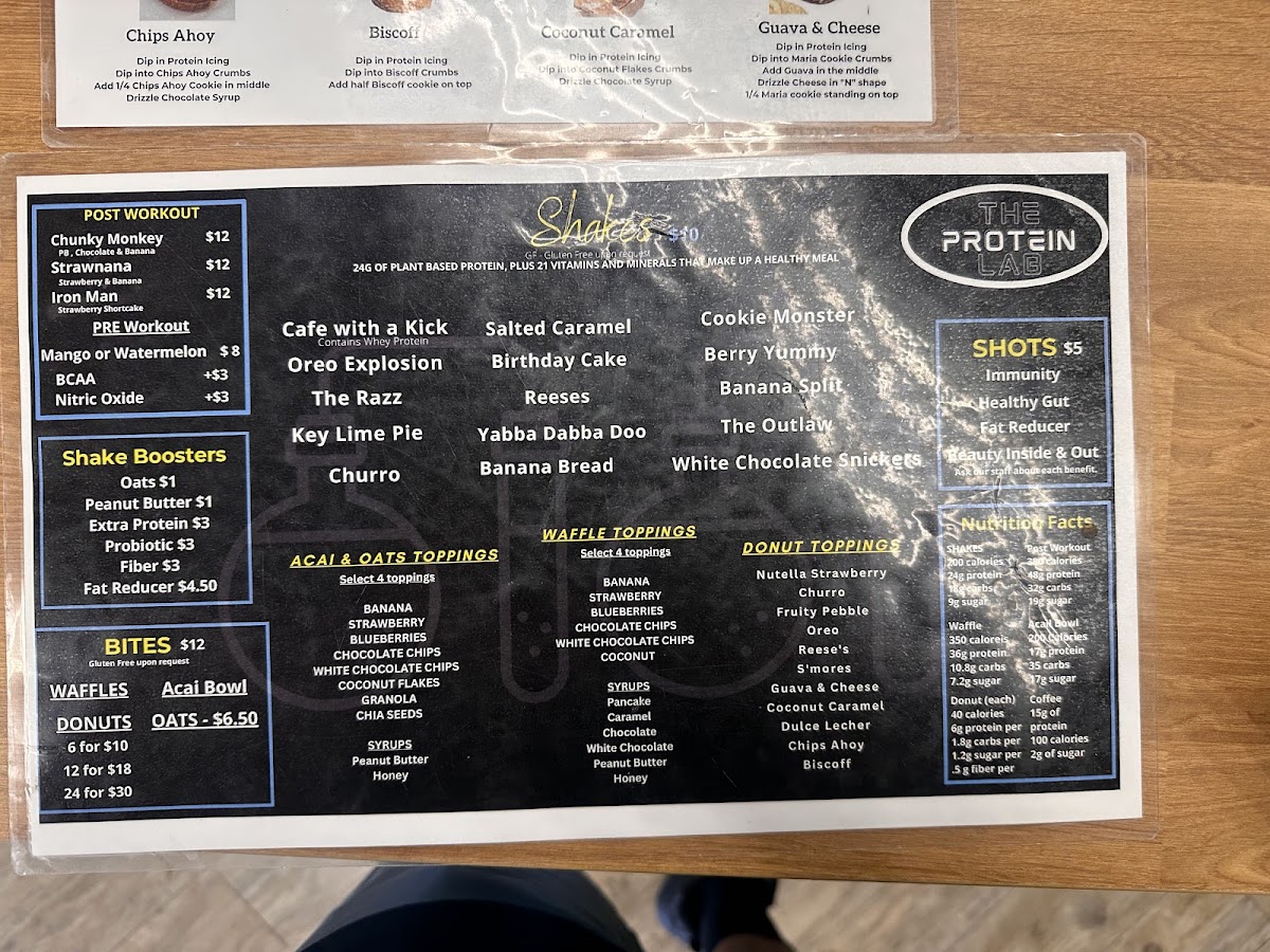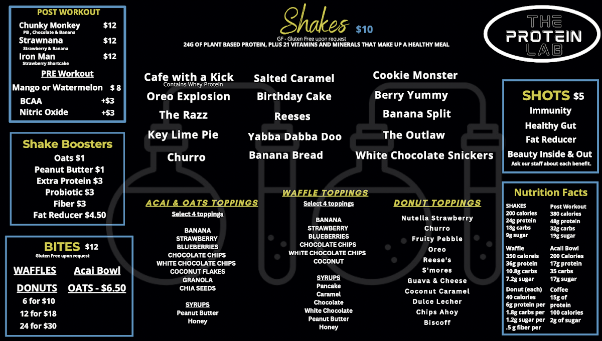 Overall, Protein Lab Shake Bar combines nutritional value with delightful flavors, offering a menu that caters to every need, whether you're working out, looking for a snack, or simply craving something healthy and delicious. With such a diverse selection, there's truly something for everyone.
